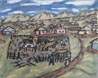Ngcobo’s art features bold colour and line use with simplified forms that is reminiscent of post-impressionism. His works are done in oil pastel and acrylic.